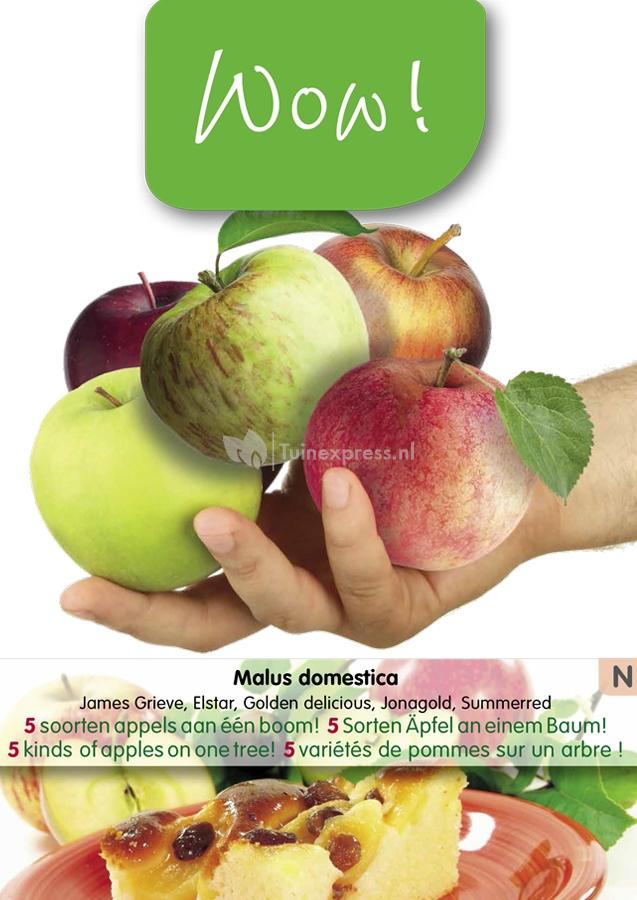 Met deze appelboom heeft u maar liefst 5 soorten appels op 1 stam! Meerdere bomen zijn niet meer nodig, de boom draagt voldoende verschillende bloesems om te kunnen bestuiven. De James Grieve en Summer Red plukt u in augustus. De Elstar vervolgens in september en de Jonagold en Golden Delicious in oktober. Zo kunt u enkele maanden achtereen van heerlijk smakende appels uit eigen tuin genieten.