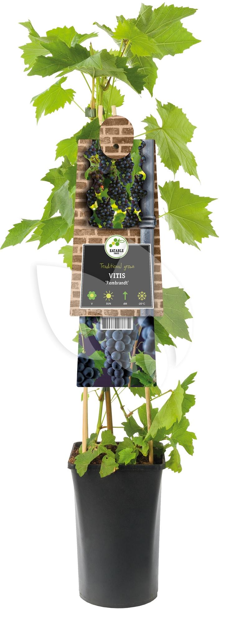 De Blauwe Druif Vitis Rembrandt 75 cm klimplant is een mooie toevoeging aan jouw tuin. De Blauwe Druif Vitis Rembrandt 75 cm klimplant groeit mooie blauwe druiven met een wat zuurdere smaak. De Blauwe Druif Vitis Rembrandt 75 cm klimplant is winterhard en is bladverliezend in de winter. Het is een snelgroeiende plant met een grote oogst.