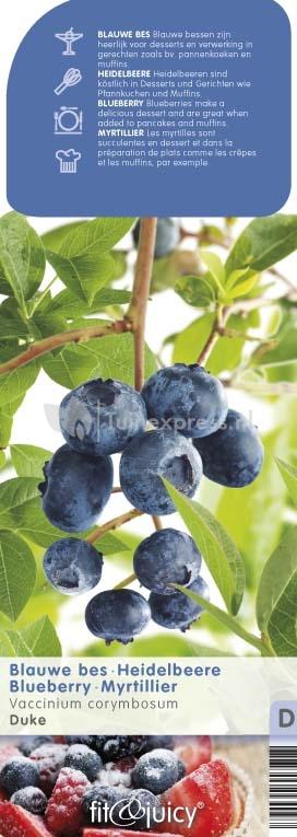 De Duke is een zeer productieve bosbessenplant. De aromatische, zoete bessen zijn vrij groot van formaat. De bessen zijn rijp vanaf juli en de trossen volgen elkaar op, in één keer oogsten is dus niet nodig, u kunt over langere periode van de bosbessen genieten. Bosbessen zijn heerlijk om vers te eten, maar ook zeer goed te verwerken in jams, sappen en desserts.
