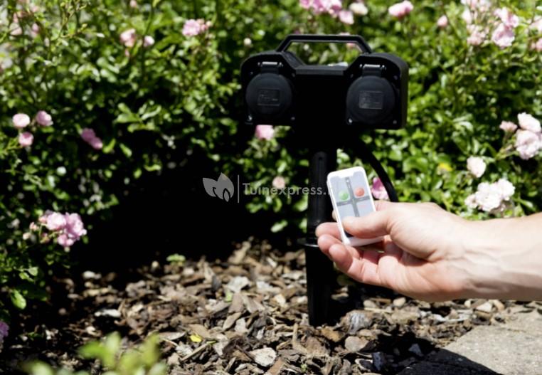 Dit stopcontact voor buiten heeft twee aansluitingen voor stekkers en wordt geleverd met een afstandsbediening. Hierdoor is het stopcontact wat breder dan de overige buitenstopcontacten. Het heeft een grondpin om het stopcontact makkelijk te kunnen plaatsen in de tuin en is IP44 (spat)waterdicht. Het stopcontact wordt geleverd met een kabel van 1,5 meter lang die is voorzien van een stekker.