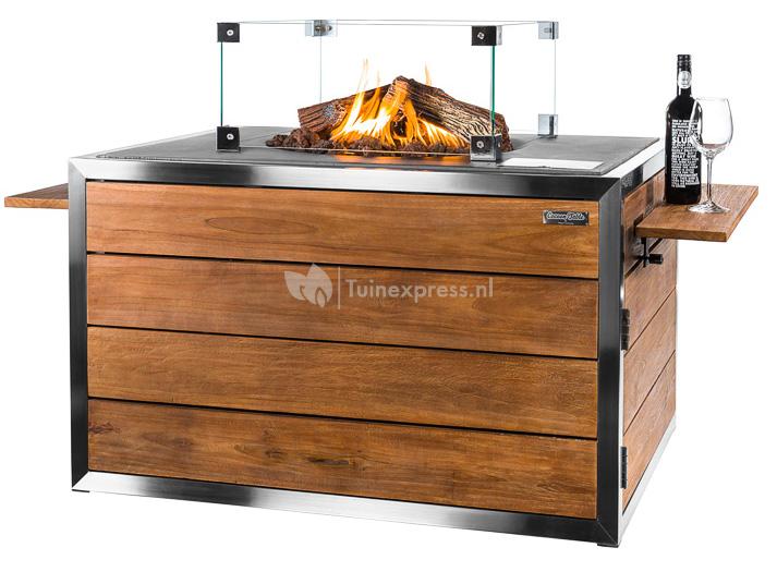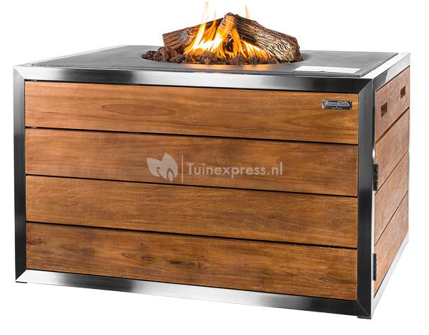 Het vuur van de buitenhaard wordt gevoed door een ingebouwde gashaard met een RVS-brander van 19.5 kW. De brander is mooi gecamoufleerd met optische lavastenen en houtblokken. Door middel van de elektronische ontsteking is de haard gemakkelijk te ontsteken. De hoogte van de vlam kunt u afstellen door middel van een draaiknop in het bedieningspaneel. De elektronische ontsteking met thermokoppel heeft een veiligheidsontwerp dat CE goedgekeurd is. Het vuur geeft geen rook of vonken af waardoor de vuurtafel zeer gebruiksvriendelijk en veilig in gebruik is.