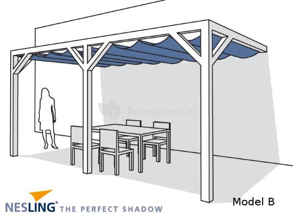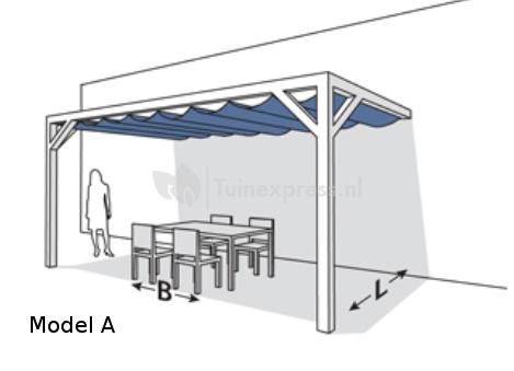 De pergola’s met harmonicadoek van 370 cm breed worden geleverd met een houtpakket van 12 cm dikke palen. Bij de overige afmetingen zijn de palen 9 cm dik. De pergola’s met een harmonicadoek van 5 meter lang (Model B) hebben een extra staander ter ondersteuning. De liggers bestaan dan uit 2 palen van 250 cm en worden met elkaar verbonden middels de bijgeleverde Pergola Kit Verlenging elementen.