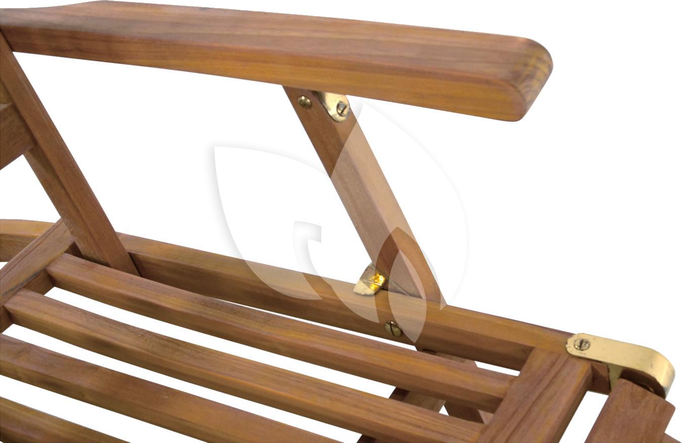 Robuuste ligstoel van teakhout met goudkleurige metalen scharnieren. Zowel de rugleuning als het voeteneind zijn verstelbaar bij dit tuinbed. Het teakhout heeft een natuurlijke uitstraling en door een kussen toe te voegen is dit ligbed ook nog eens extra comfortabel. De armsteunen van het houten zonnebed zijn lekker breed voor extra gebruiksgemak.