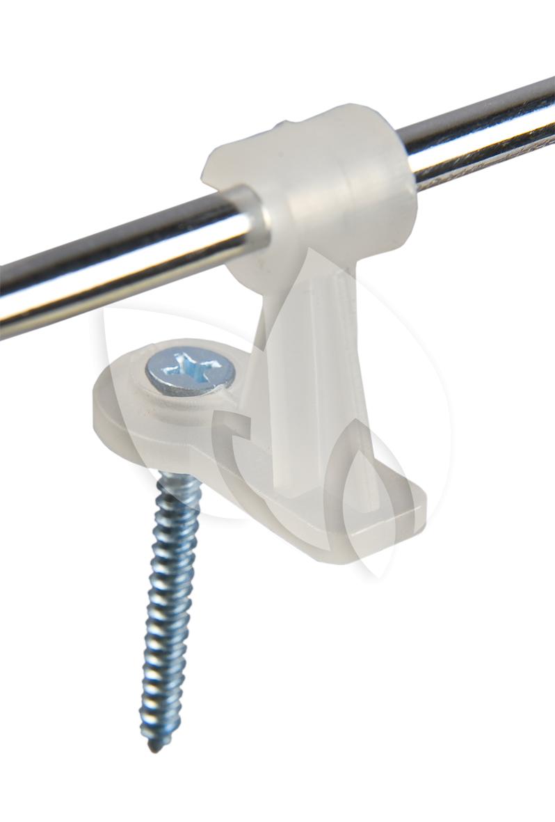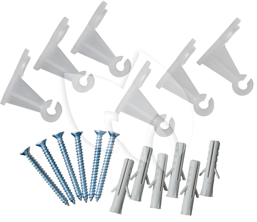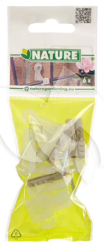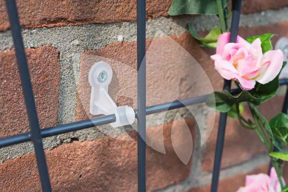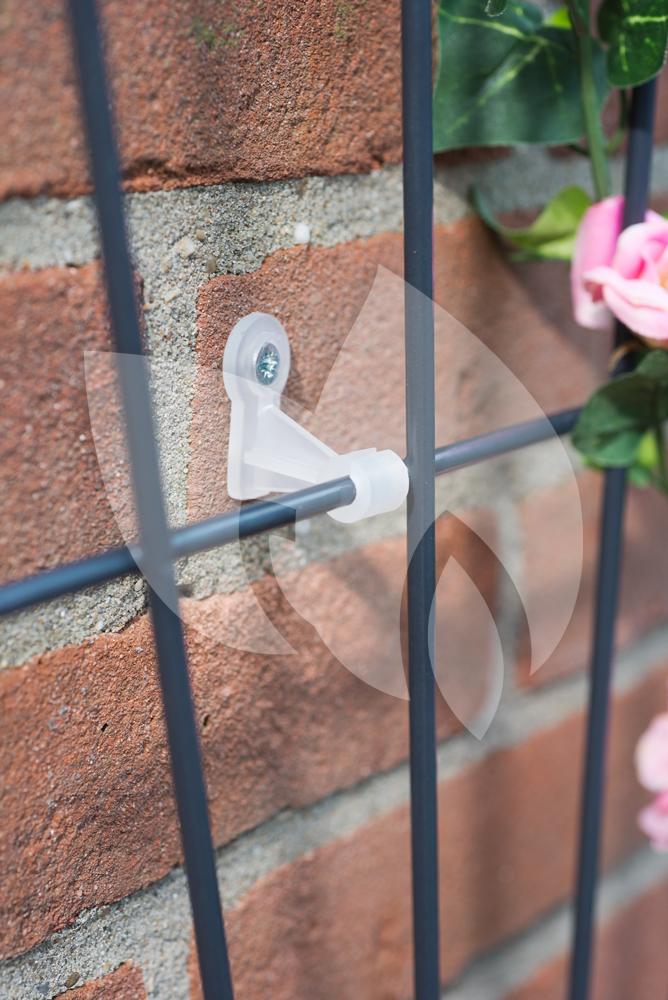 Kunststof muurbeugels voor het bevestigen van een draadklimrek aan muur of schutting. Verpakt per 6 stuks en geleverd inclusief bijhorende pluggen en schroeven.