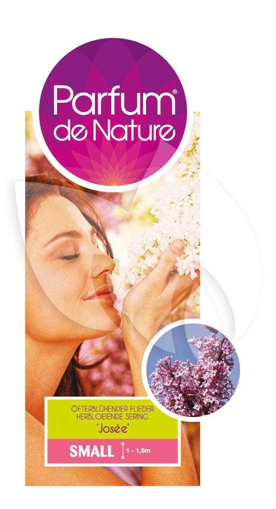 De merklijn “Parfum de Nature” staat voor seringen van een speciale kweek. Zoals de naam al doet vermoeden is de dwergsering met deze toevoeging heerlijk geurend. Een enting op een speciale onderstam maakt dat deze sering een zeer sterk wortelgestel heeft en wilde scheuten vrijwel uitgesloten zijn. Daarnaast is de plant al twee jaar oud, opgekweekt in pot en dus het gehele jaar te planten. Josee Parfum de Nature bloeit met lila roze bloemetjes in mei die een heerlijk zoete geur verspreiden. In de nazomer zal de dwergsering nogmaals de lucht betoveren met deze fijne geur.