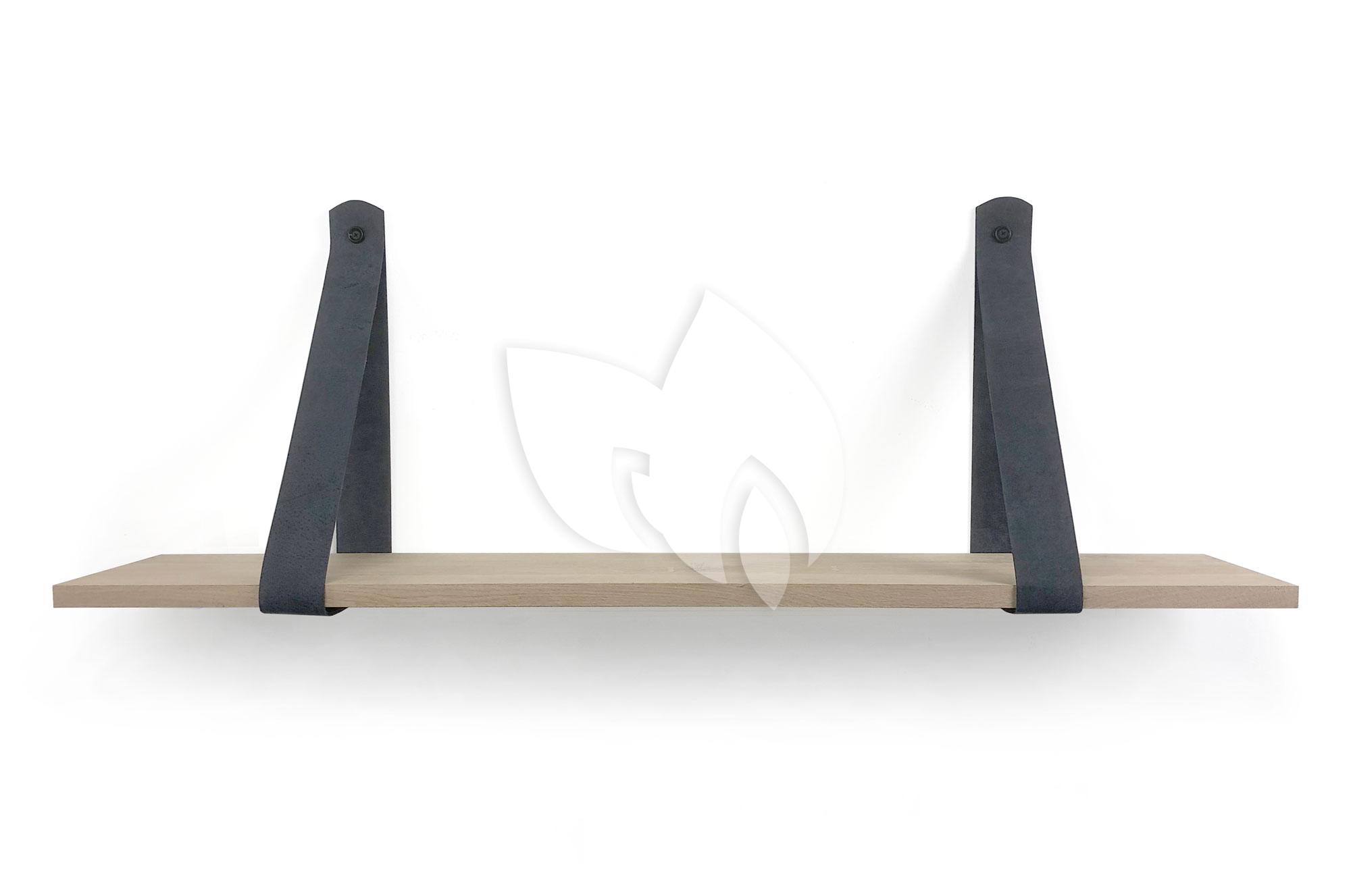 Eiken 18mm wandplank recht 140 x 30 cm inclusief leren riemen grijs