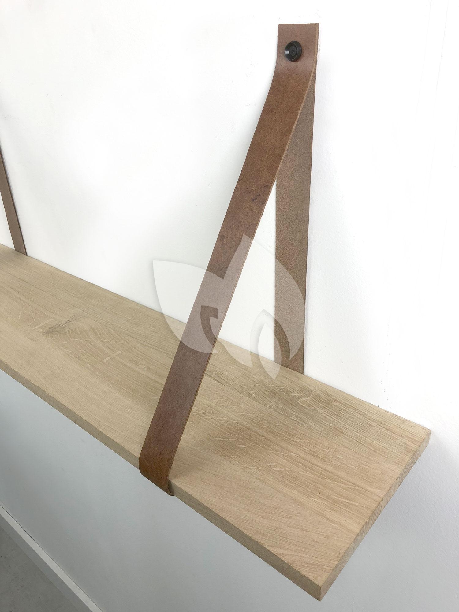 Eiken 18mm wandplank recht 60 x 30 cm inclusief leren riemen cognac