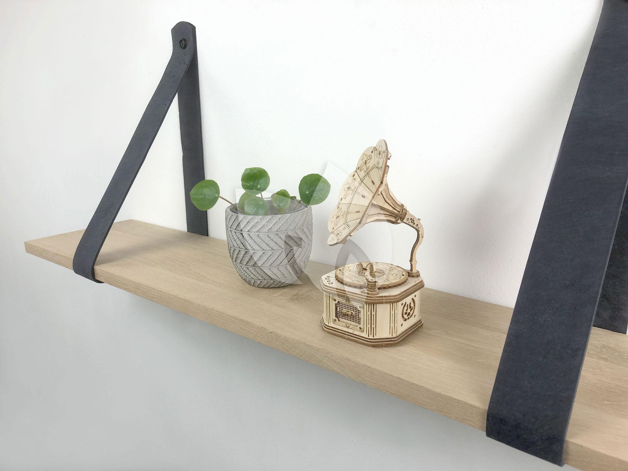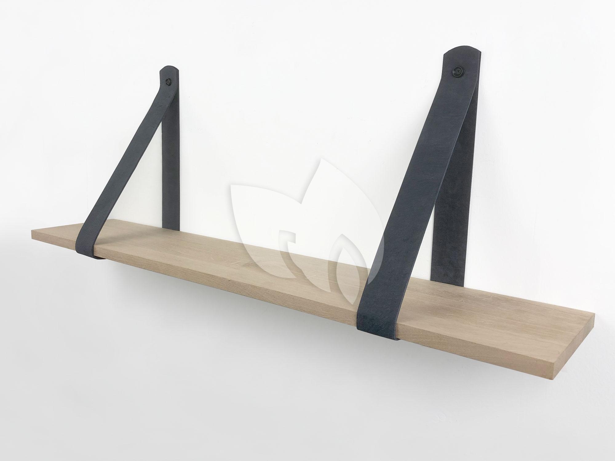 Eiken 18mm wandplank recht 75 x 20 cm inclusief leren riemen grijs