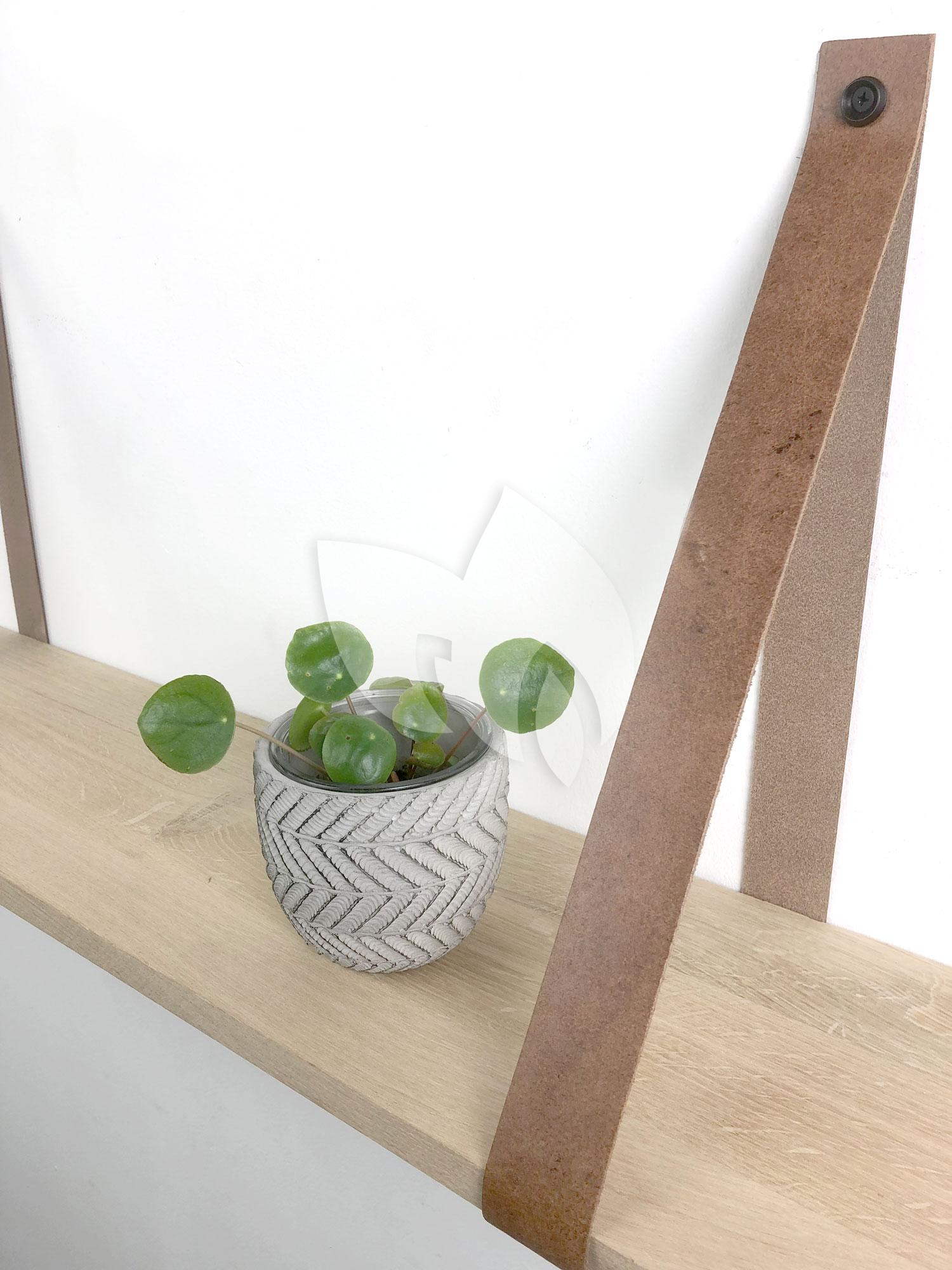 Eiken 18mm wandplank recht 80 x 30 cm inclusief leren riemen cognac