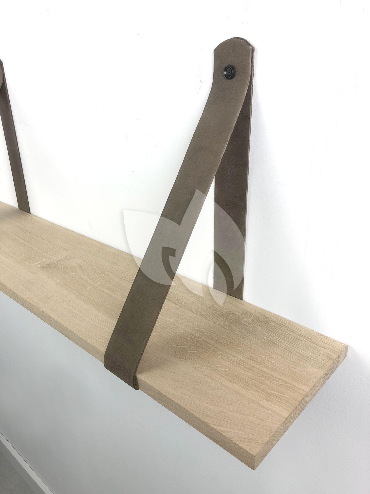 Eiken 18mm wandplank recht 90 x 30 cm inclusief leren riemen bruin