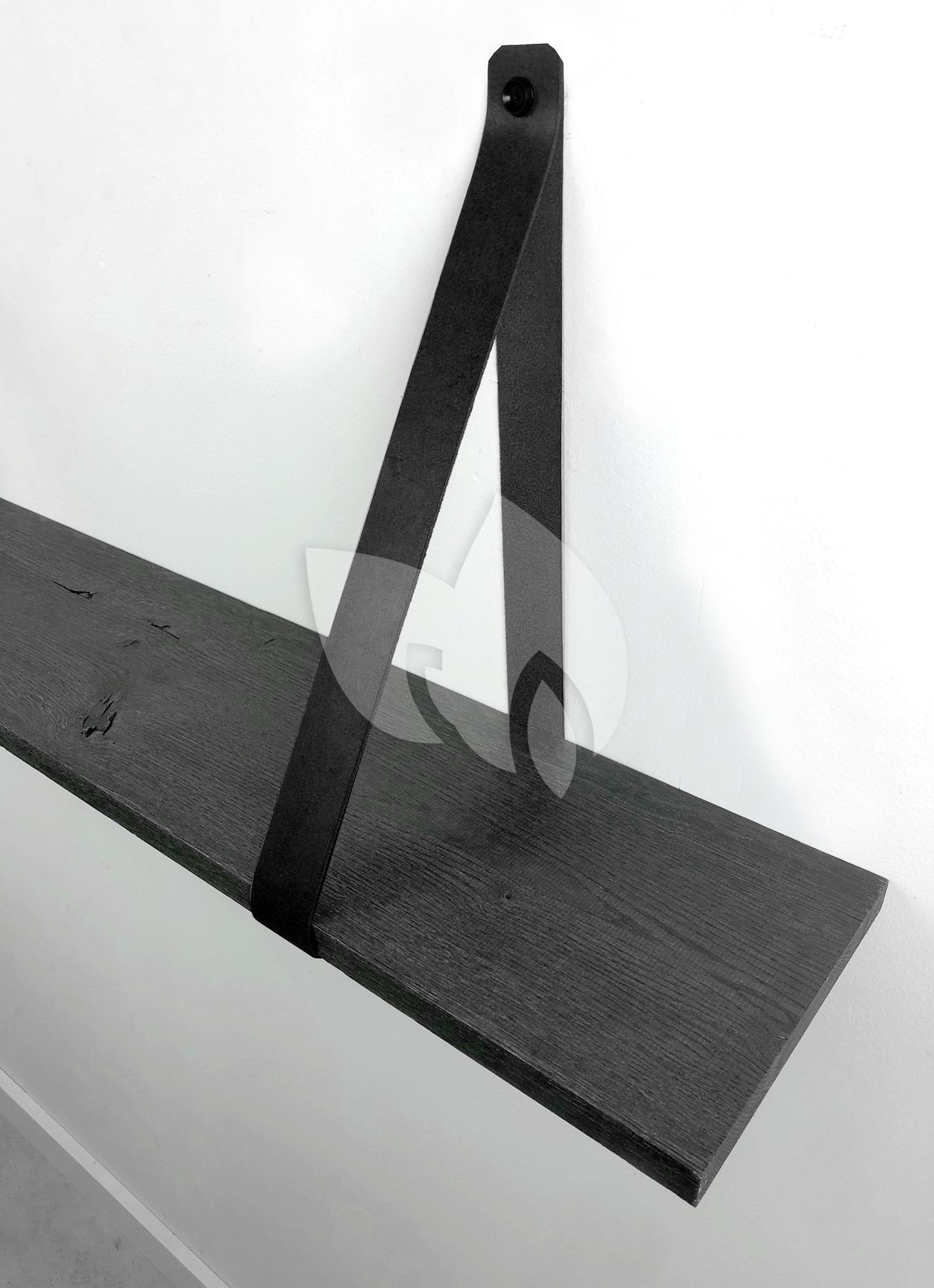 Eiken 18mm wandplank recht zwart 120 x 20 cm inclusief leren riemen zwart