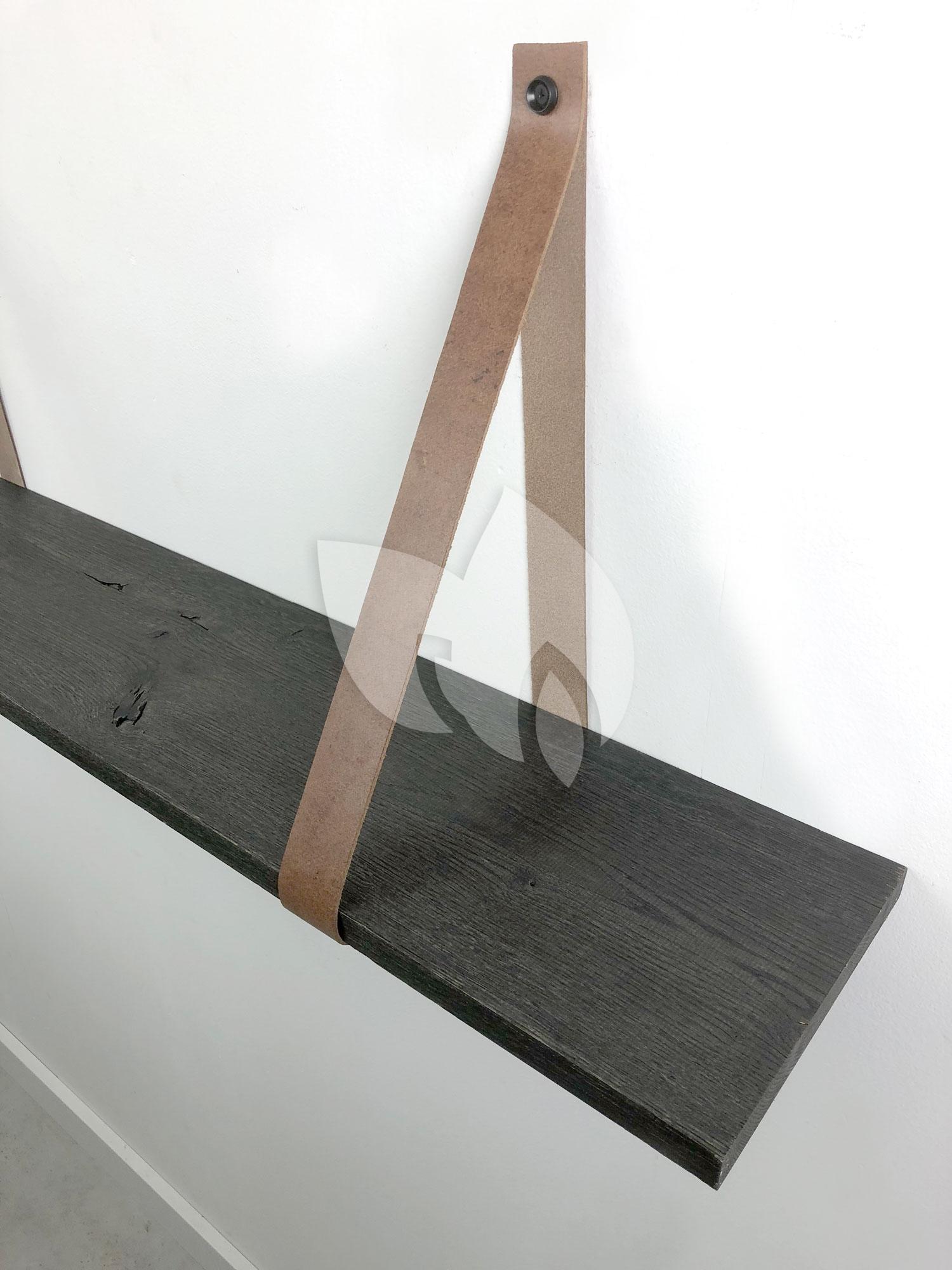 Eiken 18mm wandplank recht zwart 50 x 20 cm inclusief leren riemen cognac