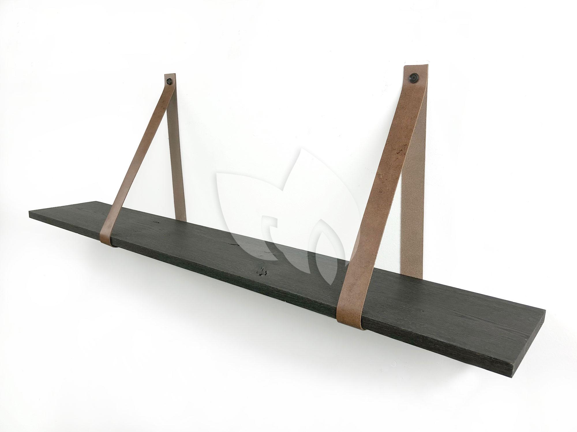 Eiken 18mm wandplank recht zwart 80 x 20 cm inclusief leren riemen cognac