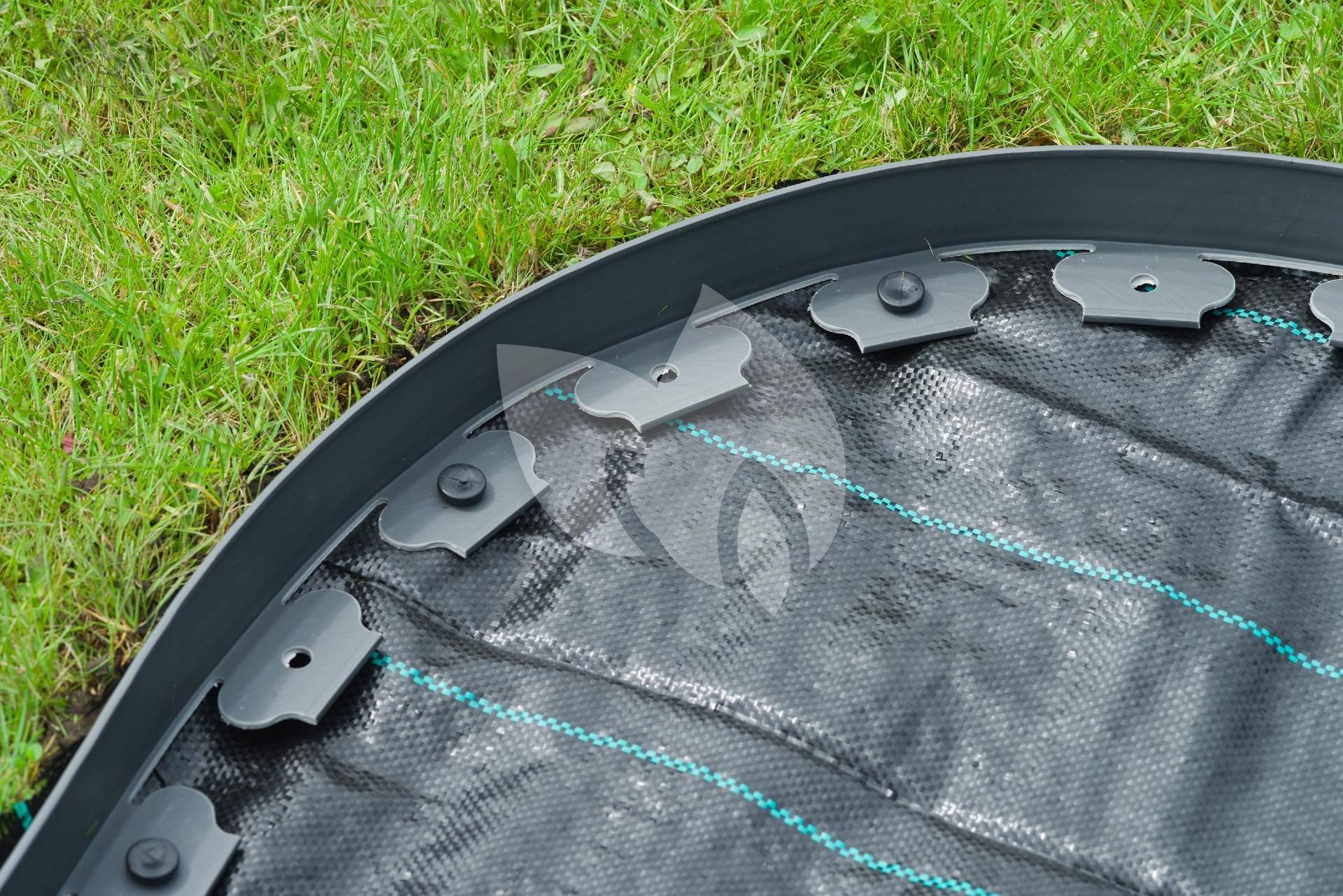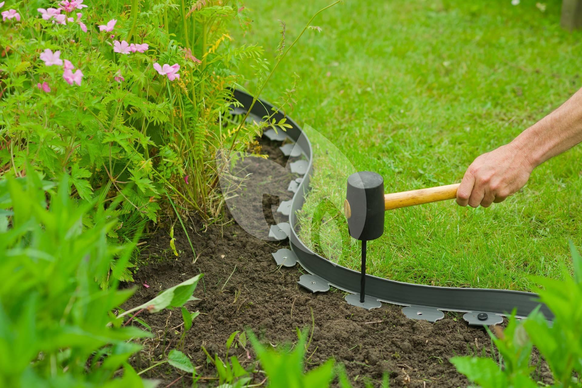 Flexibele borderrand geschikt voor bijvoorbeeld een scheiding tussen gras en gazon of grindpad of voor het afbakenen van een boom of ander voorwerp. De rand is bestand tegen schokken, uv en temperatuurschommelingen. Doordat de rand flexibel is, kan deze worden gebruikt voor rechte, maar ook gebogen of ronde scheidingen (minimale Ø 18 cm). Plaats de rand rechtstreeks in de losse grond en zet deze vervolgens stevig vast met grondpennen met schroefnagel vorm van 20cm hoog.