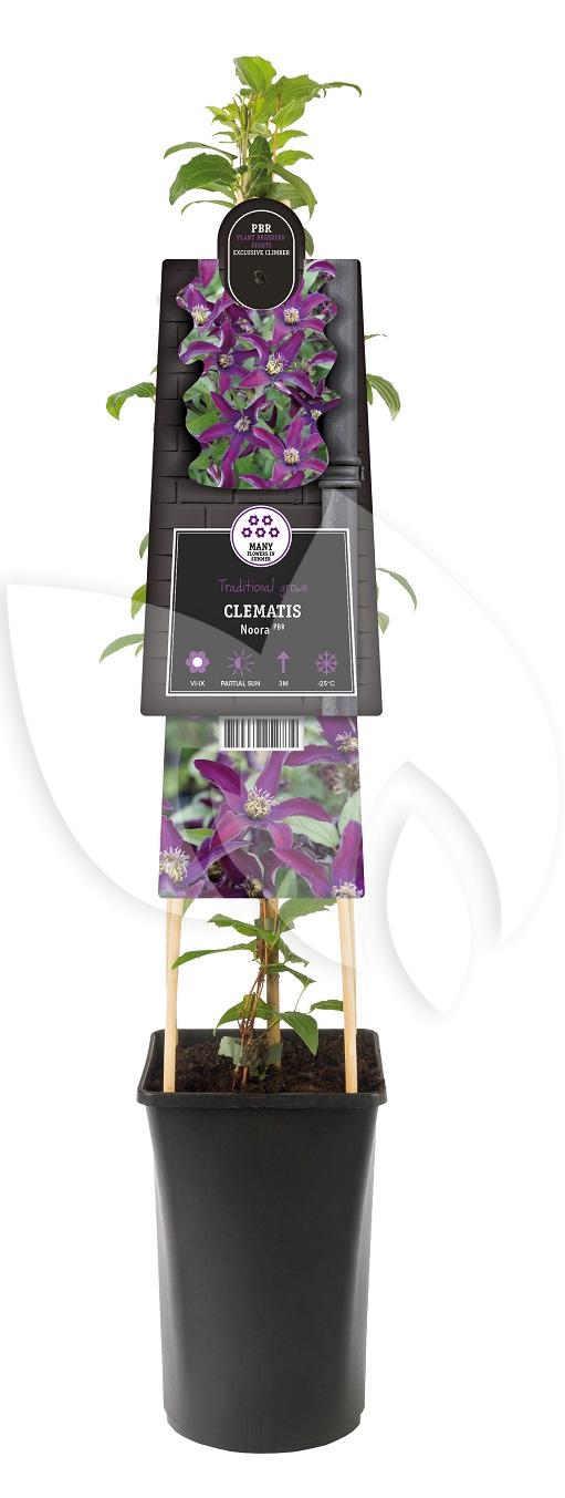De Clematis Noora is een echte eyecatcher in de tuin. De plant heeft prachtige donkerpaarse bloemen die prachtig op het oog zijn. Combineer deze klimplant met andere tuinplanten en plaats deze in het zonnetje zodat jouw tuin er op zijn mooist bij staat tijdens de zomermaanden.