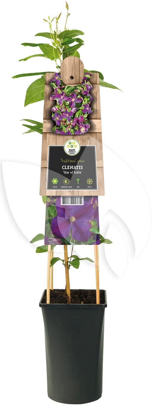 De Clematis Star of India is een echte aanwinst voor in de tuin. Deze klimplant staat bekend om zijn prachtige bloemen die erg sfeervol zijn. Deze klimplant heeft paars met rode bloemen die samen tot een unieke kleur vormen. Geniet met volle teugen van jouw sfeervolle tuin met de Clematis Star of India.