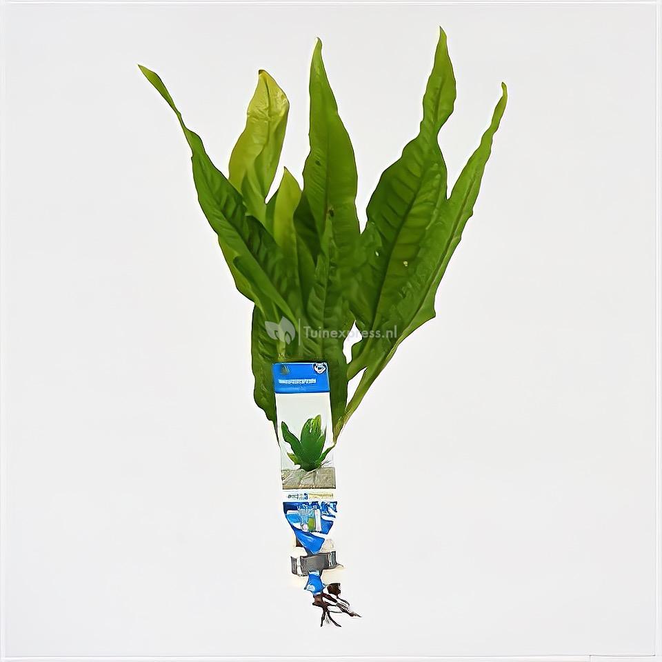 De Microrsorium Pteropus is een compacte aquariumplant die langzaam groeit. Het is een zeer sterke plant met lancetvormige, smalle bladeren met een olijfgroene kleur. Bij hogere temperaturen kunnen de bekende zwarte vlekjes op de bladeren (sporen) zich vermeerderen. Schrik hier niet van. Microsorum pteropus is een varen uit Azië en stelt niet veel eisen betreft verzorging. De wortelstok mag enkel niet in het substraat komen, aangezien er dan de kans bestaat op rotting. Microsorum pteropus hecht zich het beste vast op hout of stenen met een ruw oppervlak.
