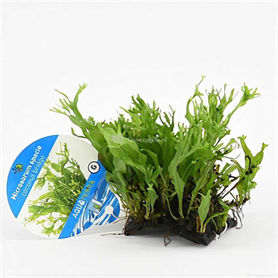 De Microsorum specie is een variant binnen het geslacht Microsorum. Deze soort onderscheid zich door kleine geveerde uiteinden aan het blad. Het is een kleine, compacte aquariumplant die langzaam groeit. Het is een zeer sterke plant met lichtgroene kleur. Door zijn compactheid en langzame groei is deze Microsorum specie ideaal om op decoratiemateriaal te binden. Hier is de plant op een bruggetje van kokosnoot gebonden wat zeer decoratief staat in het aquarium of plaats hem zo om een filter in het aquarium te camoufleren.