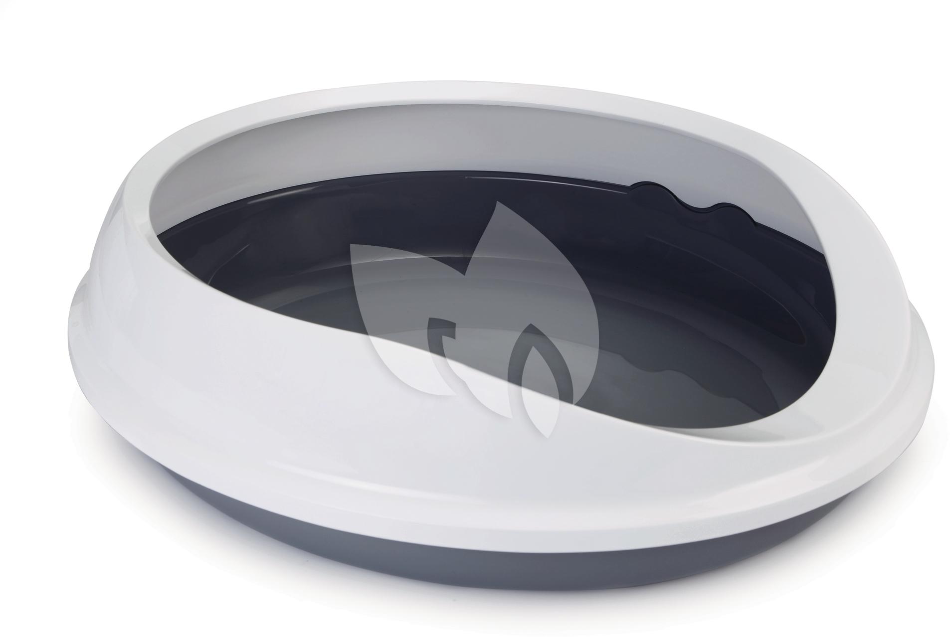 Kattenbak Figaro. Deze ovale kattenbak is een degelijke open bak met een afneembare rand. Doorsnede: 40 cm. Kleur: grijs.