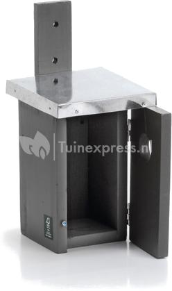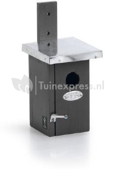Een strak afgewerkt houten nestkastje voor winterkoninkjes. Deze is in een modieuze grijze kleurstelling en voorzien van een zinken dakje. Eenvoudig aan de muur of een boom te bevestigen.