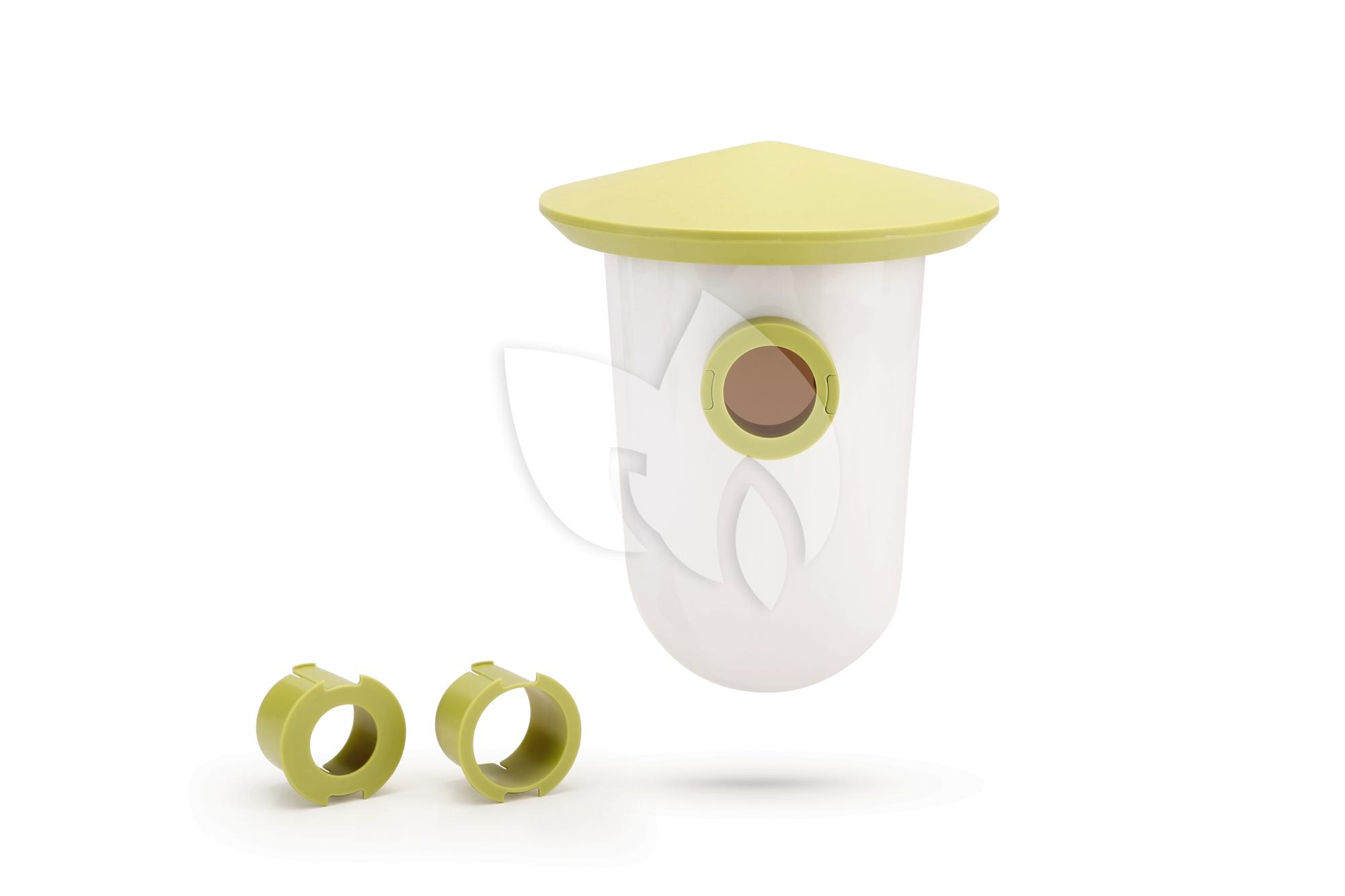 Een modieuze en eigentijdse broedhuisje voor onze kleine gevederde vriendjes. Dit broedhuisje uit de Singing Friend collectie kan op verschillende manieren bevestigt worden. Deze kan middels een schroef aan de muur bevestigt worden maar ook aan zowel horizontale als verticale oppervlaktes. Denk bij dit laatste aan een schutting of regenpijp doormiddel van het meegeleverde klittenband. Eens gemonteerd, is het broedhuisje heel makkelijk schoon te maken. U draait de silo een slag en deze komt los van het dakje. Uiteraard ook weer makkelijk terug te hangen door deze tegen het dakje aan te houden en wederom een slag te draaien. Dakje en voeropening zijn beide waterdicht. Kleur: groen.