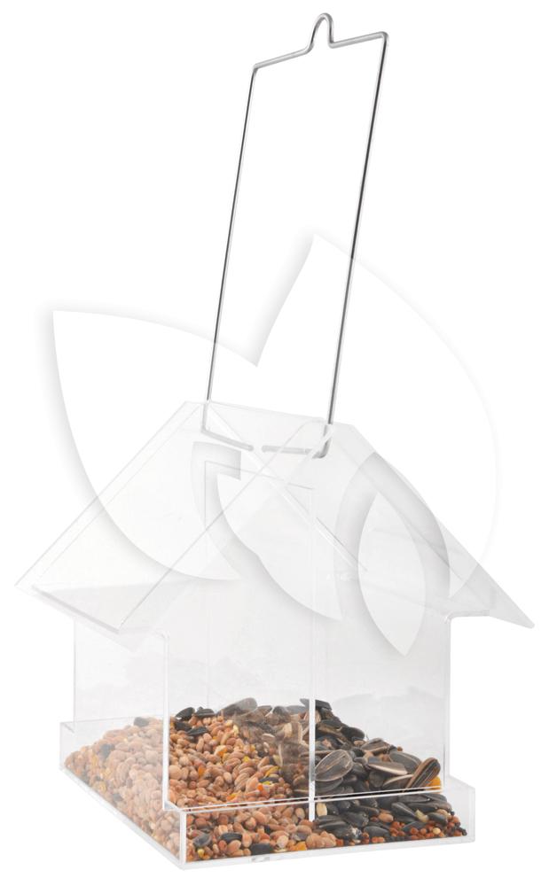 Dit transparante vogelhuisje hangt u met de bijbehorende haak makkelijk op aan bijvoorbeeld een tak. Het vogelhuisje heeft een scheidingswand waardoor u een combinatie van voer kunt aanbieden. Zo kunt u meerdere soorten vogels naar uw tuin lokken want iedere vogelsoort heeft zijn eigen favoriete pitten en zaden.