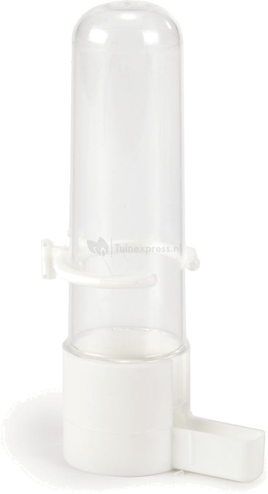 Een plastic drink en voederfontein groot, staafmodel, voor diverse vogelkooien. Kleur: wit, transparant.