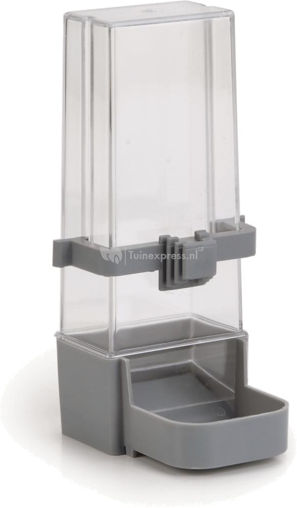 Een plastic voeder en drinkfontein voor de parkiet. Voor diverse vogelkooien. Kleur: grijs, transparant.