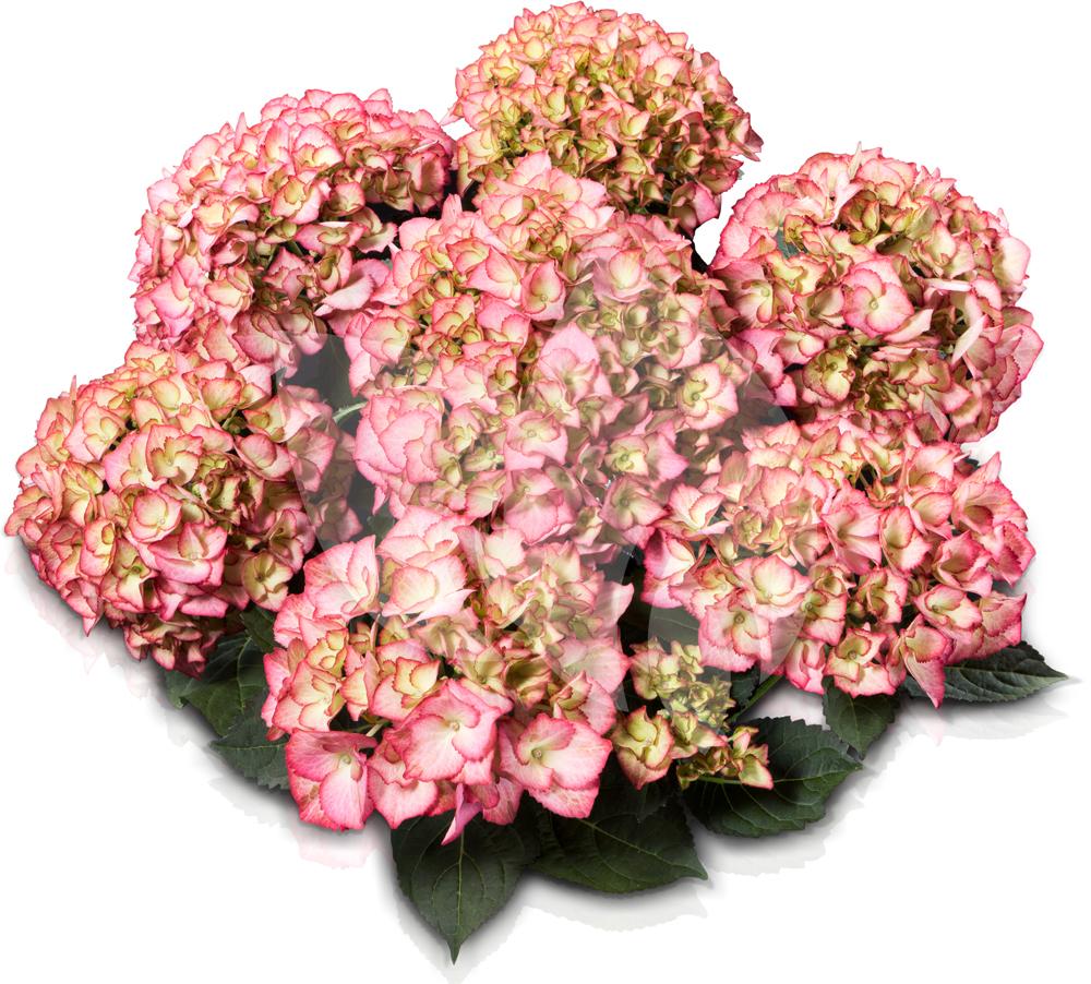Deze tweekleurige hortensia is een populaire plant onder de hortensialiefhebbers. De plant opent zijn bloemen in een crème witte kleur, op dat moment is enkel het randje van het bloemblad roze gekleurd. Naarmate de bloeiperiode vordert zal het bloemblad geheel roze kleuren vanaf de rand waardoor er uiteindelijk een grote bol van roze bloemen aan de hortensia prijkt!