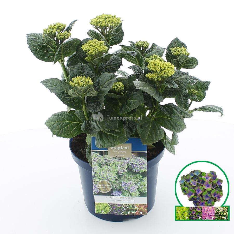 Uiteraard kent de Magical Coral een mooie kleurverandering tijdens de bloeiperiode van deze hortensia. De groen is in den beginne blauw met groene details. Aan het eind van de bloeiperiode zal de bloem groen zijn met een opvallend wit/blauw randje. Het is een sterkte hortensia, de bloembollen blijven zelfs mooi in de zon en de takken zijn opvallend sterk. Wie wil dit plaatje nu niet in de tuin laten schitteren?