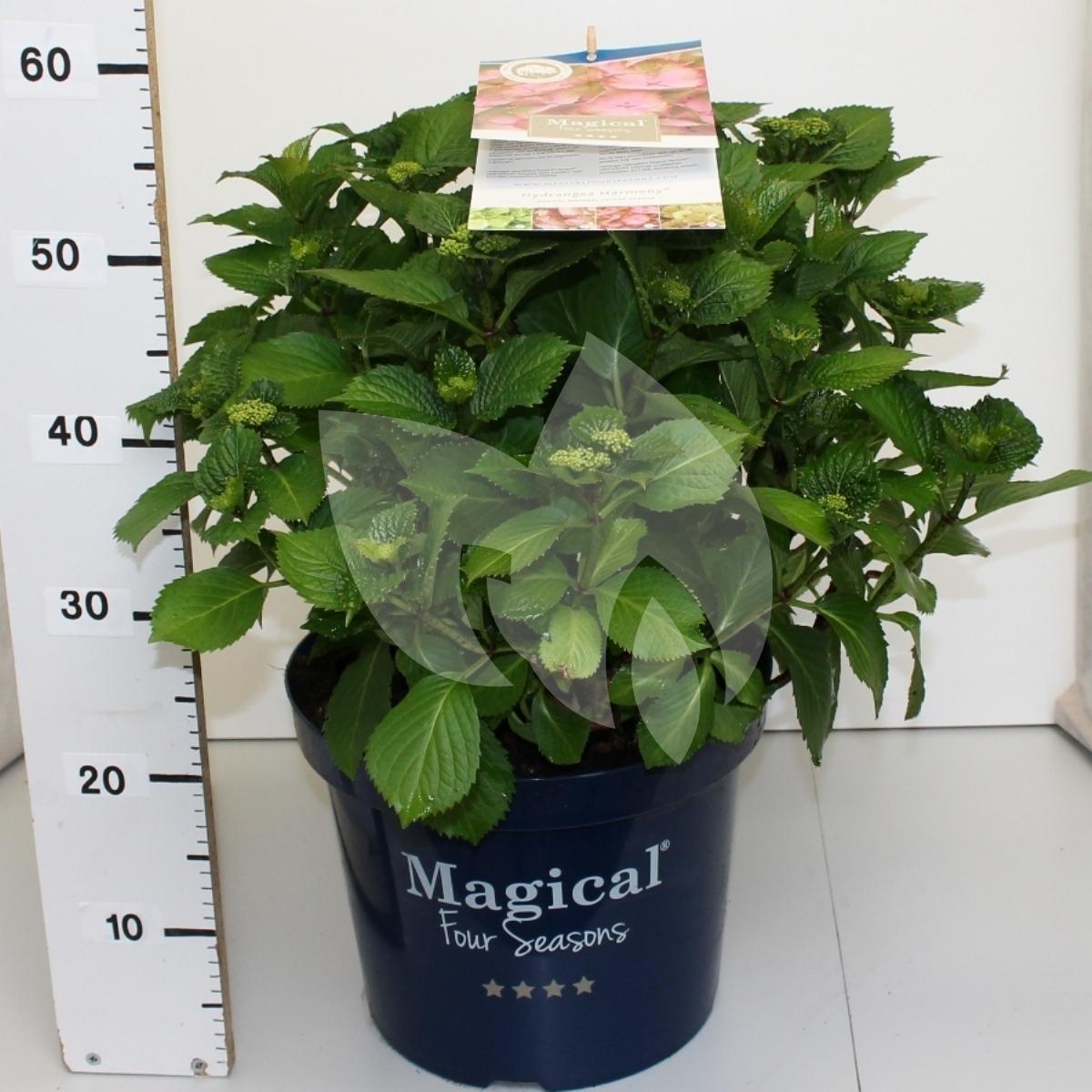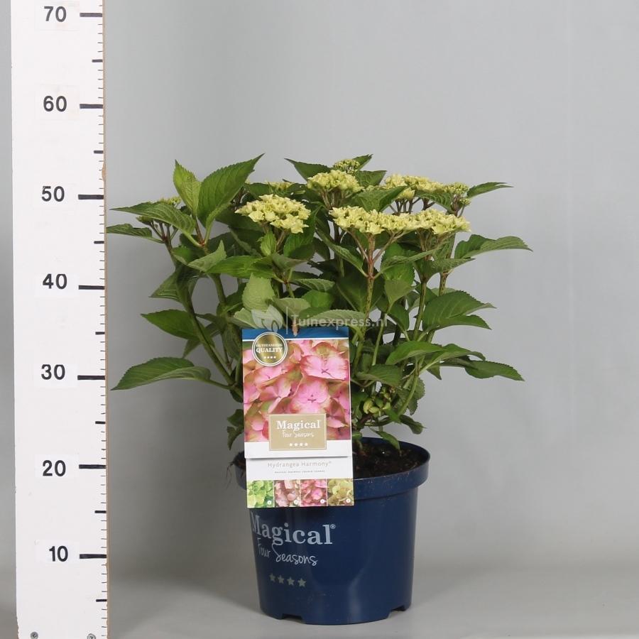 Deze Magical Harmony behoort tot de zogenaamde Four Seasons hortensia’s die allen gekenmerkt worden door een verkleuring van de bloem. De hortensia’s nemen gedurende het bloeiseizoen 3 tot 4 verschillende kleuren aan wat een prachtig effect geeft aan de plant. Deze Magical Harmony kleurt van groen steeds feller roze om tot slot weer af te sluiten als groene bloembol met opvallende roze details. Een plaatje om te zien!