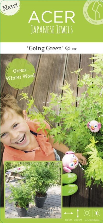 Het gehele jaar door heeft deze esdoorn een hoge decoratieve factor. Waar de meeste Japanse esdoorn soorten geroemd zijn om hun prachtig verkleurende blad, heeft deze 'going green' nog een extra factor; de gifgroene bast die ook in de winterperiode groen van kleur blijft. Prachtig tegen een contrasterende achtergrond! Daarnaast kleurt uiteraard ook het blad van deze varieteit van felgroen naar rood tinten in de herfst. De langzame groeier zal een uiteindelijk hoogte van 4m kunnen bereiken, maar daar is veel geduld voor nodig. Het gifgroene silhouet brengt zelfs in de winter frisse lentekleuren naar uw tuin!