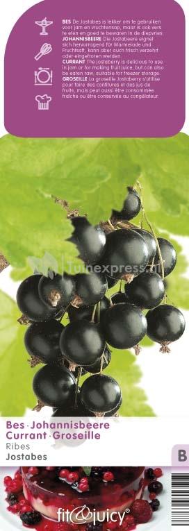 De Jostabes is een redelijk onbekende bes. Het is een bes die is ontstaan uit een kruising tussen de kruisbes en zwarte bes. De rijkelijke bloei wordt opgevolgd door zwarte bessen van ongeveer 1,5cm groot. Deze zijn plukbaar vanaf half/eind juli. Pluk ze zeker niet vroeger, ze zullen dan nog te zuur zijn. Rijpe bessen zijn glimmend zwart van kleur.