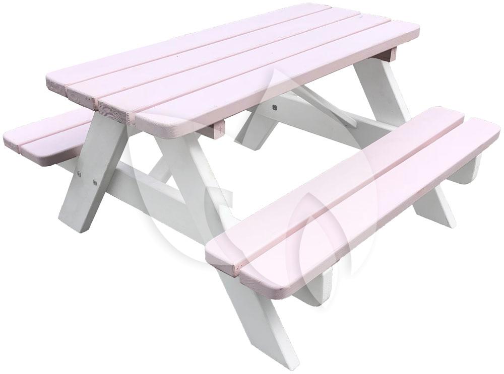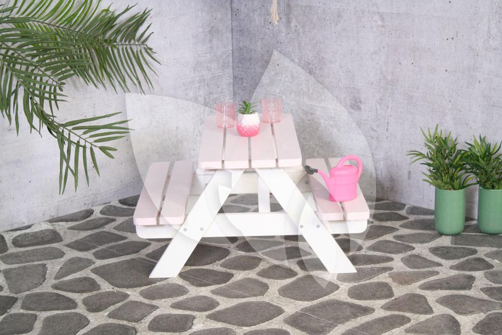 De picknicktafel is gemaakt van geïmpregneerd vurenhout en daarna in wit geverfd met een vrolijk roze tafelblad en bankjes.