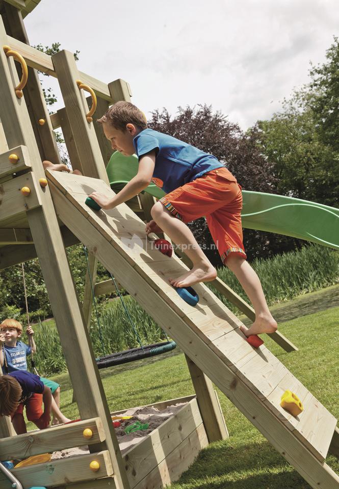Klimwand van geimpregneerd grenen voorzien van klimelementen.