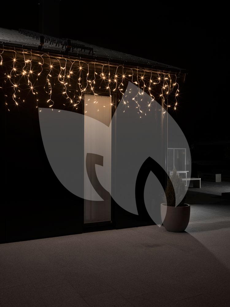 Dit LED lichtgordijn verlicht op speelse wijze uw gevel, pergola of tuinafscheiding. Het lichtgordijn heeft een lengte van 5m en hoeft enkel bevestigd te worden op de gewenste plaats. De strengen voorzien van amberkleurige LEDverlichting hangen vanuit de basis omlaag en variëren in lengte van 40cm tot 90cm. De transparante kabel is tegen iedere achtergrond te gebruiken. Breng uw omgeving om betrekkelijk eenvoudige wijze in winterse sferen met behulp van dit lichtgordijn.