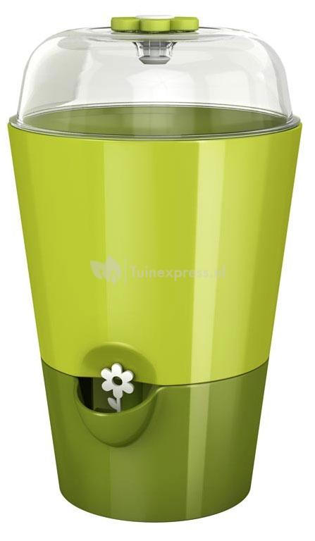 De stolp op de kruidenpot zorgt voor een optimaal leefklimaat voor uw zaaigoed waardoor de kruiden snel ontkiemen. Wanneer de scheuten 1,5 centimeter hoog zijn kan de stolp verwijderd worden. De kunststof bloem in het waterreservoir werkt als een waterindicator en geeft aan wanneer het tijd is het waterreservoir bij te vullen. Wanneer de bloem verdwenen is moet er water gegeven worden.