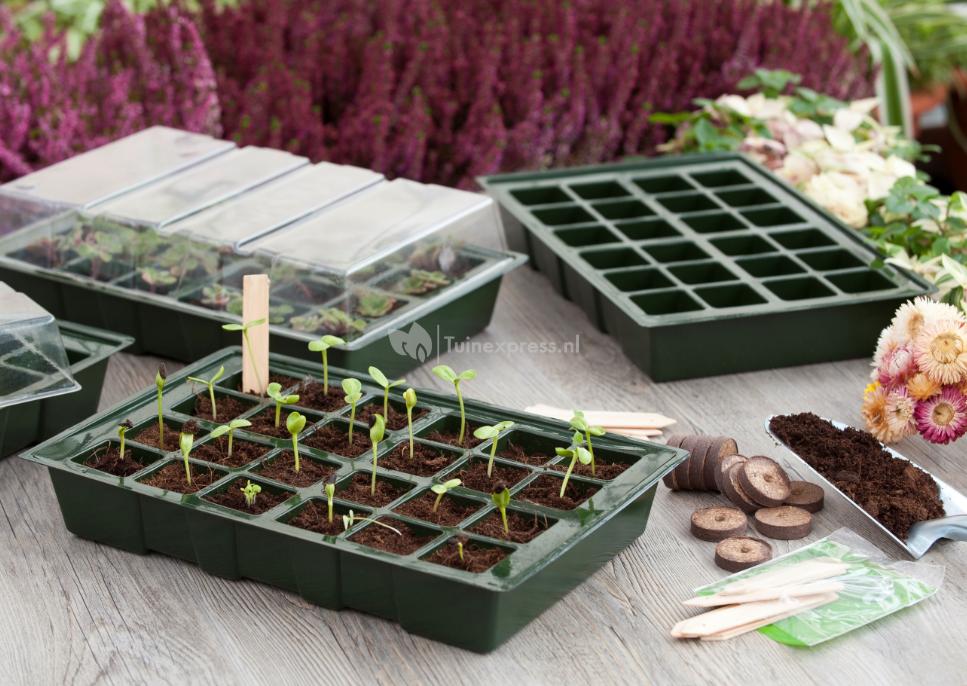 De kweekbakset bestaat uit 4 trays. Twee van deze trays zijn voorzien van afwateringsopeningen, zodat het overtollig water weg kan lopen. Elke tray bestaat uit 24 vakjes, waardoor u verschillende zaailingen kunt planten. De kweekbak is gemaakt van flexibel kunststof en heeft een platte bodem. In het set zitten twee transparante deksels.