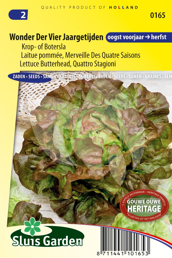 Wonder Der Vier Jaargetijden is een snel kiemende en groeiende zwartzadig allround ras met botermalse, stevige en vaste kroppen en een goudgeel hart. De kropsla is een combinatie van een fraaie roodkleuring en boterzacht blad, die veel vitamine C bevat. Deze verfrissende groente is niet alleen heerlijk in salades, maar ook in stampotten of als garnering bij gerechten!
