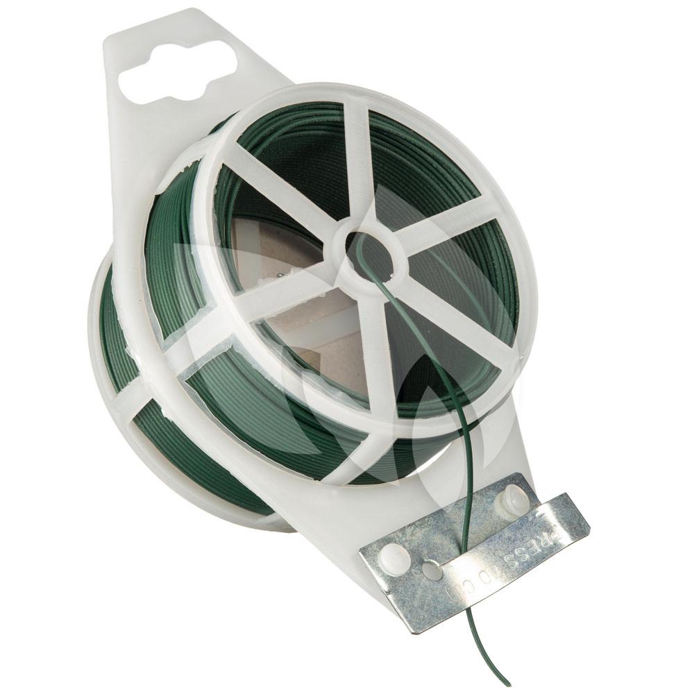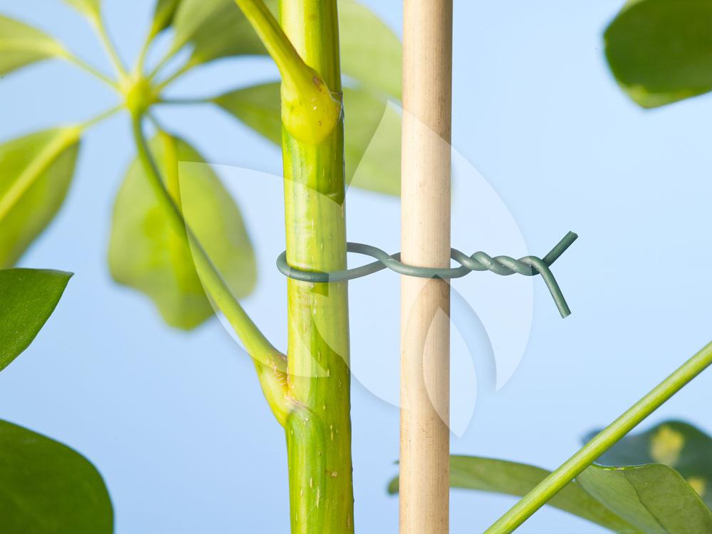Binddraad met ijzeren kern voor het vastzetten van takken aan bijvoorbeeld trellis. Dankzij de groene kleur is het draad niet goed zichtbaar tussen al het groen.