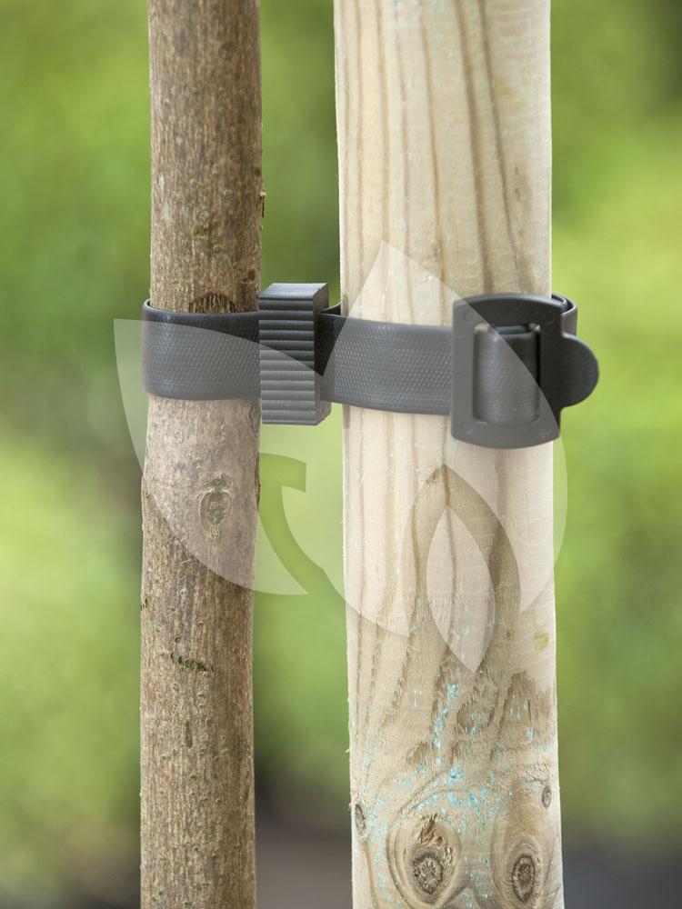 De boomband is vast te zetten aan een stok of paal middels een gesp waardoor hij ten alle tijden te verstellen is. Met de gesp kunt u de boomband verstellen en laten meegroeien met de dikte van de boom.
