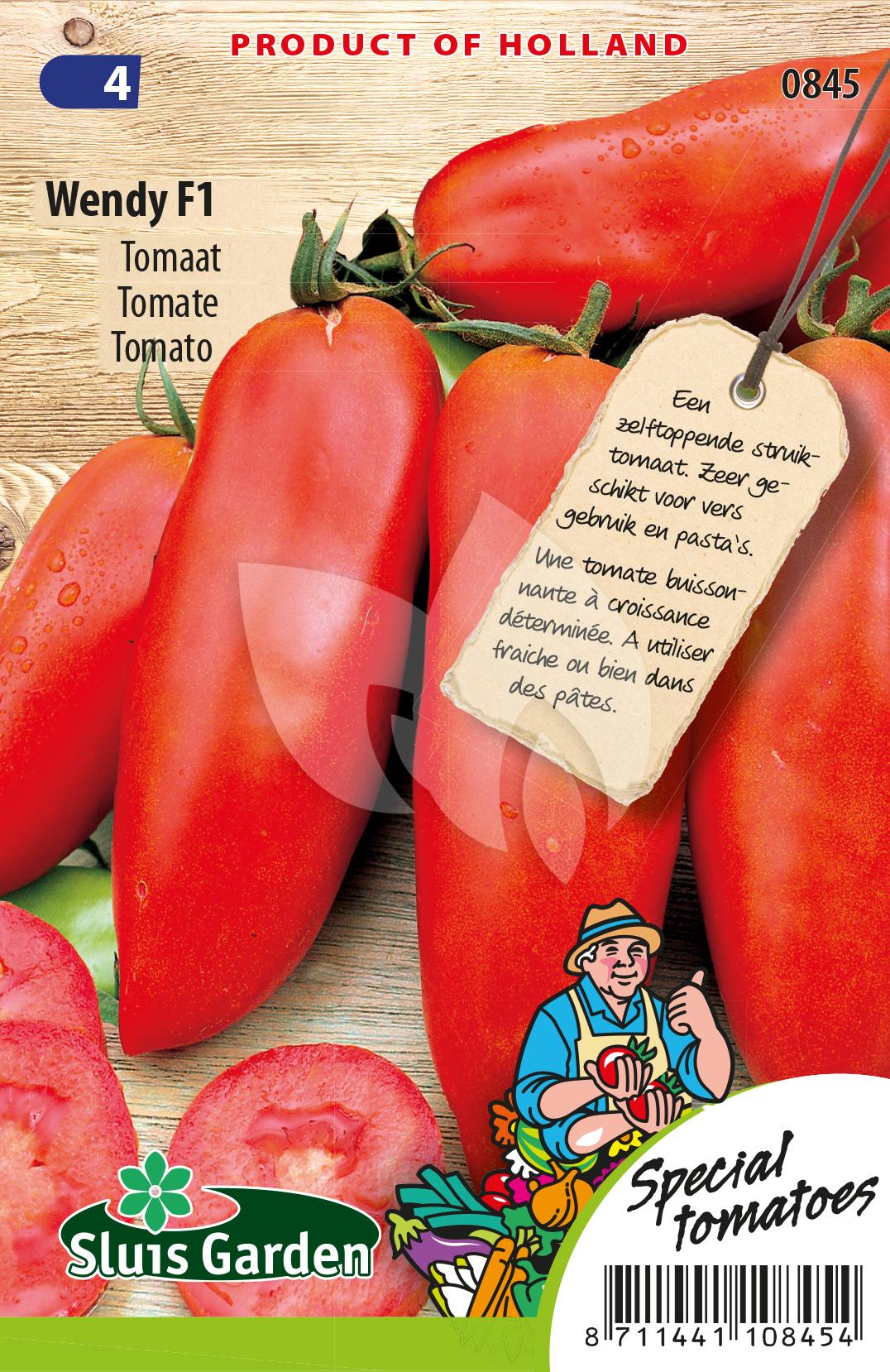 De Wendy F1 is een zelftoppende struiktomaat. Dit hybride ras zorgt voor circa 10 cm lange donkerrode vruchten met een gewicht van om en nabij 75 gram. ''Wendy'' is een heerlijke langwerpige tomaat die zeer geschikt is voor vers gebruik , bijvoorbeeld in een salade, of voor het maken van pasta's!