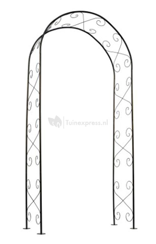 Klassieke metalen rozenboog met decoratieve krullen. Deze boogvormige rozenboog kan als entree in de tuin worden geplaatst of juist los in het midden van de tuin als echte eyecatcher. De rozenboog creëert een decoratieve en sprookjesachtige sfeer in de tuin. Naast de sierlijke decoratie zal de rozenboog ook functioneel houvast bieden voor rozenstruiken en klimplanten.