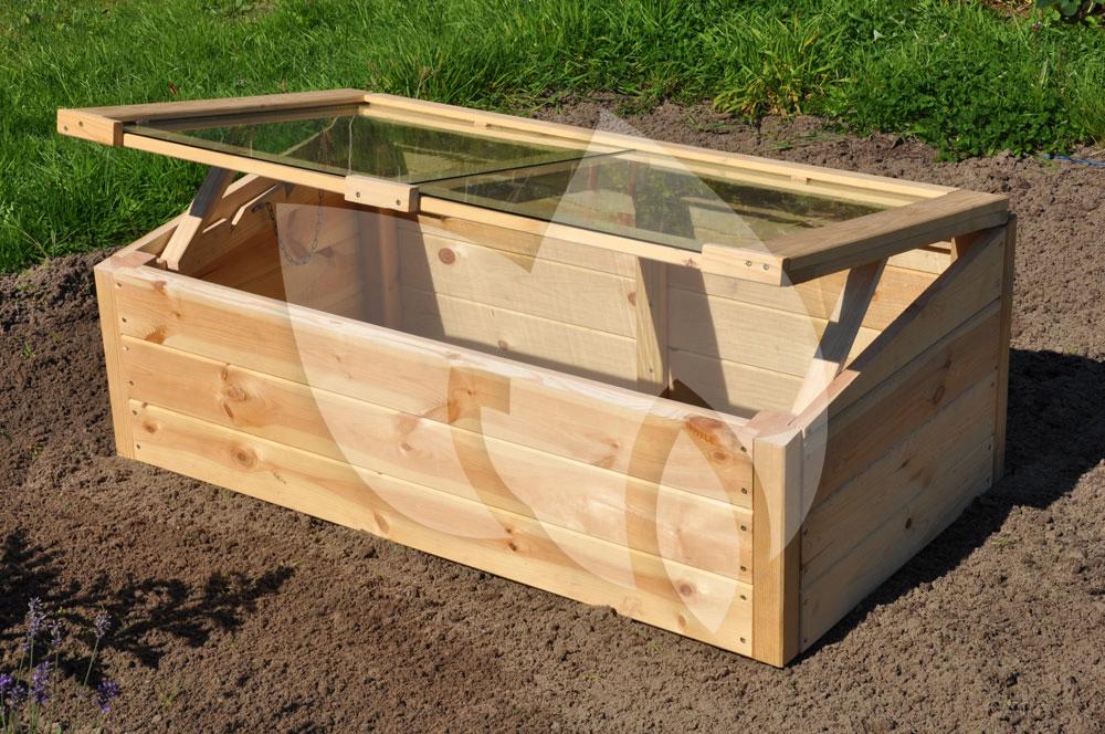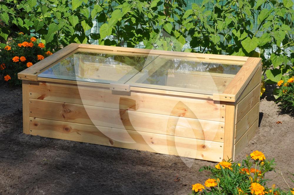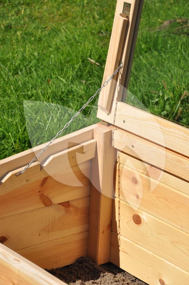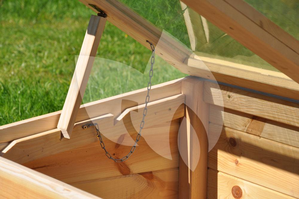 Deze kweekkas bestaat uit een houten frame en heeft een glazen afdichting. Het vurenhout heeft een dikte van 18 mm en is op ecologische wijze verduurzaamd met lijnzaadolie. Op die manier is het geschikt om jarenlang mee te gaan. De ruiten in de ‘klep’ aan de bovenzijde van de kweekkas zijn van 3 mm dik veiligheidsglas.