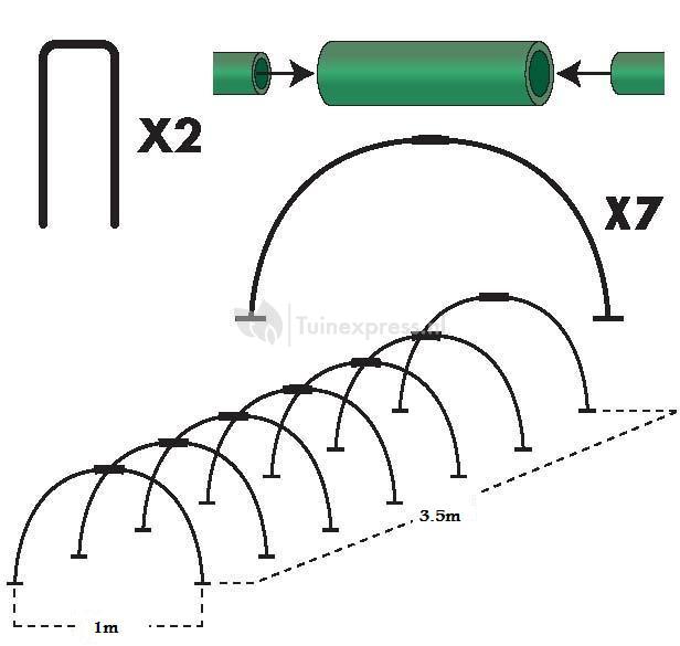 Het bouwpakket bestaat uit afdekfolie, 7 tunnelbogen, 2 haken en de nodige verbindingsstukken. Het folie is gemaakt van transparant polyethyleen (LDPE) en heeft een dikte van 50 micron. De tunnelbogen zijn 1 meter breed en hebben samen achter elkaar een lengte van 3.5 meter.