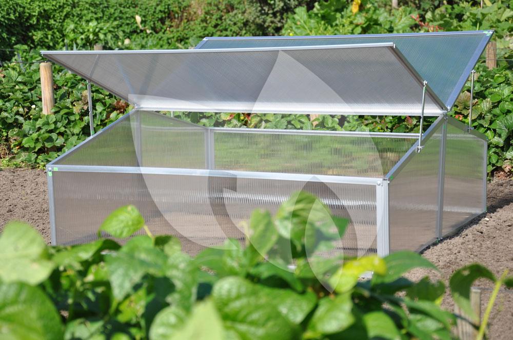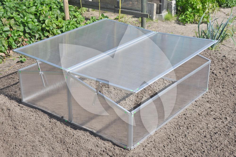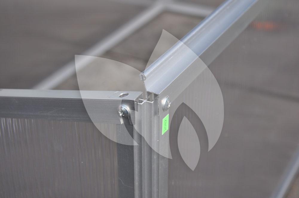 Deze kweekkas bestaat uit een onderhoudsvrij aluminium frame en een kunststof afdichting. De afdichting van polycarbonaat heeft een dikte van 4 mm en is dubbelwandig. Polycarbonaat heeft verschillende voordelen: het is niet gevoelig voor breuk, geheel veilig in gebruik en heeft het bovendien een isolerende werking.