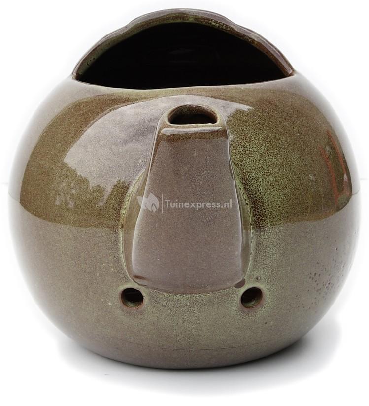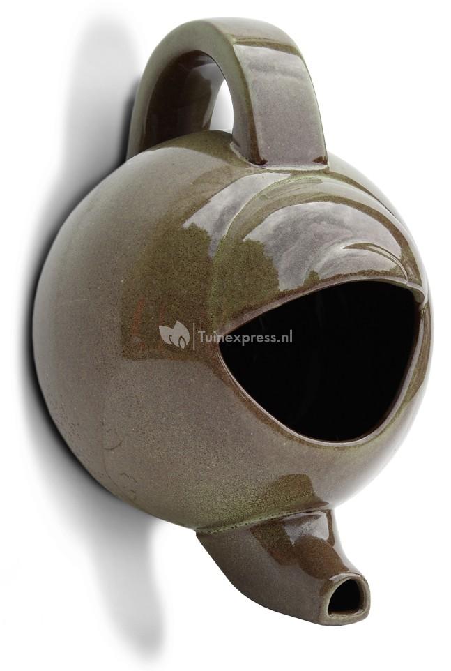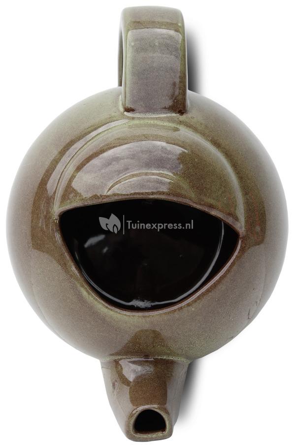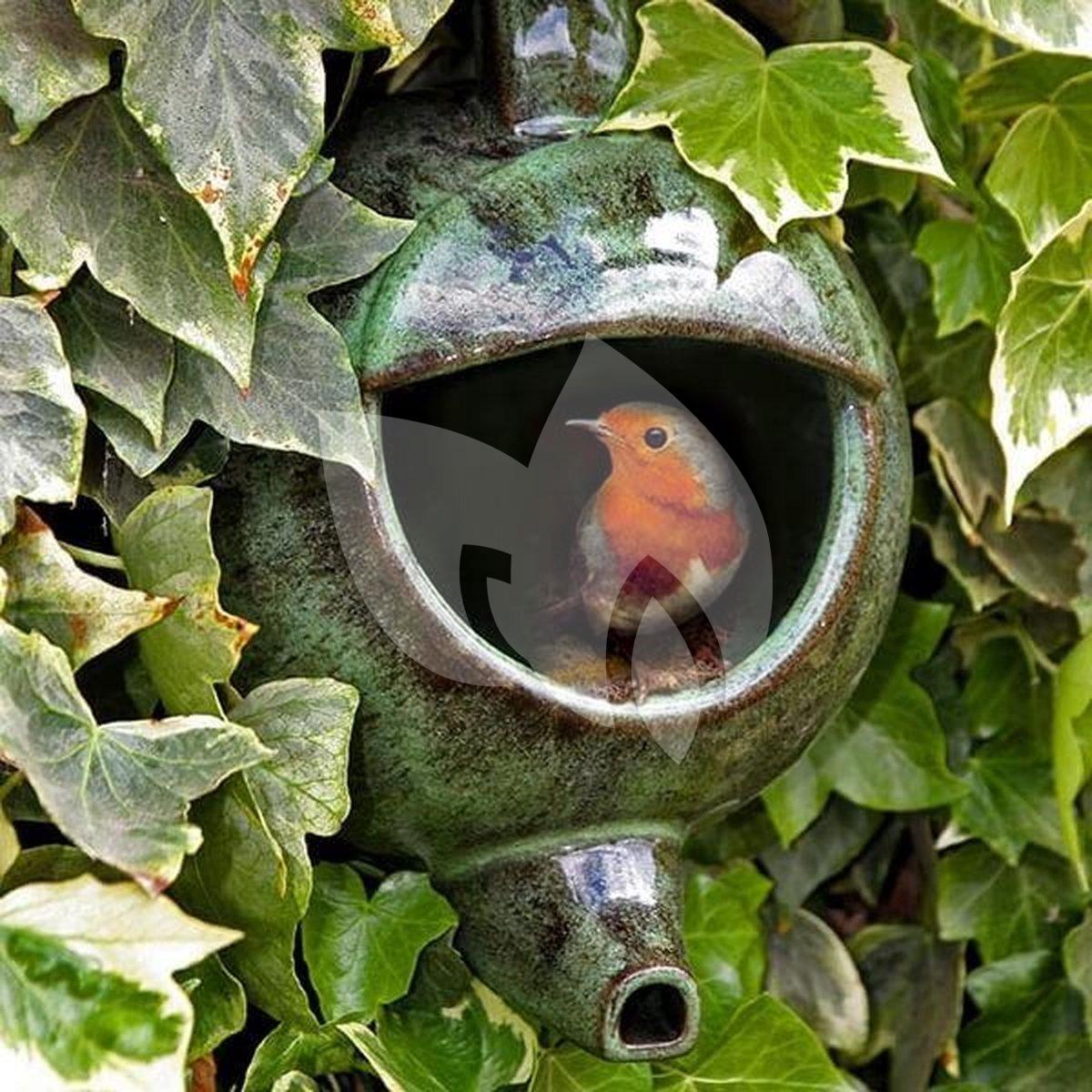 Het roodborstje is een van de meest favoriete vogels bij menig tuinliefhebber. Roodborstjes houden van nestkasten met een grote opening en dat maakt deze als theepot gevormde nestkast een favoriet voor de roodborst. Ook andere vogeltjes zoals het winterkoninkje en bonte kwikstaart hebben de voorkeur voor een grote opening en kunnen zich hier ook in nestelen. De theepot is gemaakt van vorstbestendig hoog-gebakken keramiek met groen glazuur en heeft gaten voor drainage. Tevens is hij makkelijk op te hangen met tuindraad door het montagegat of gebruik een schroef en meegeleverde rubberen ring voor bevestiging. Hang het nestkastje in een bossige omgeving tussen de bomen, struiken of heg.