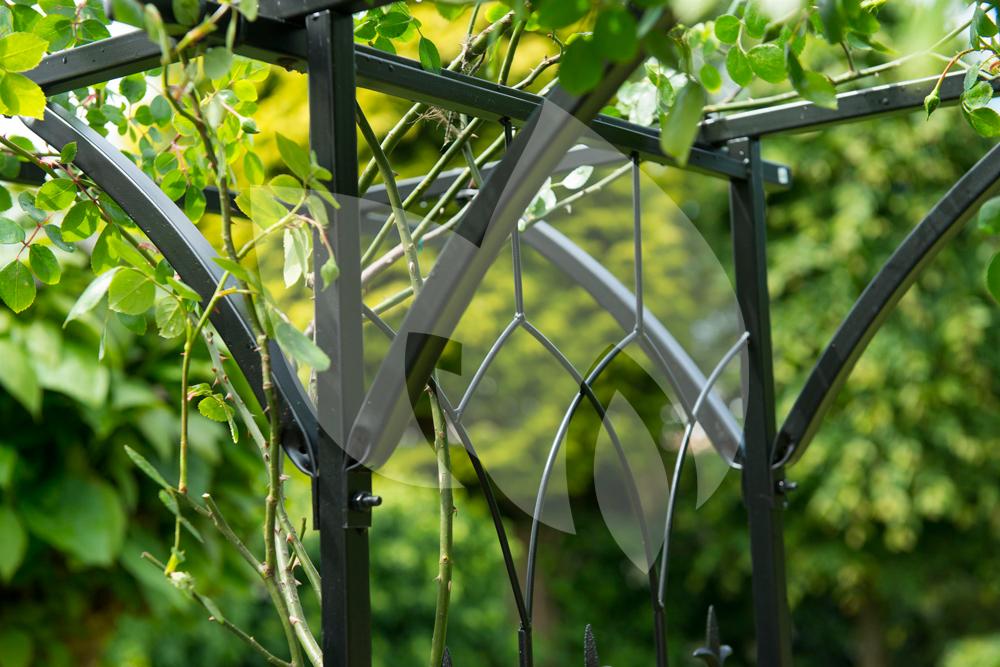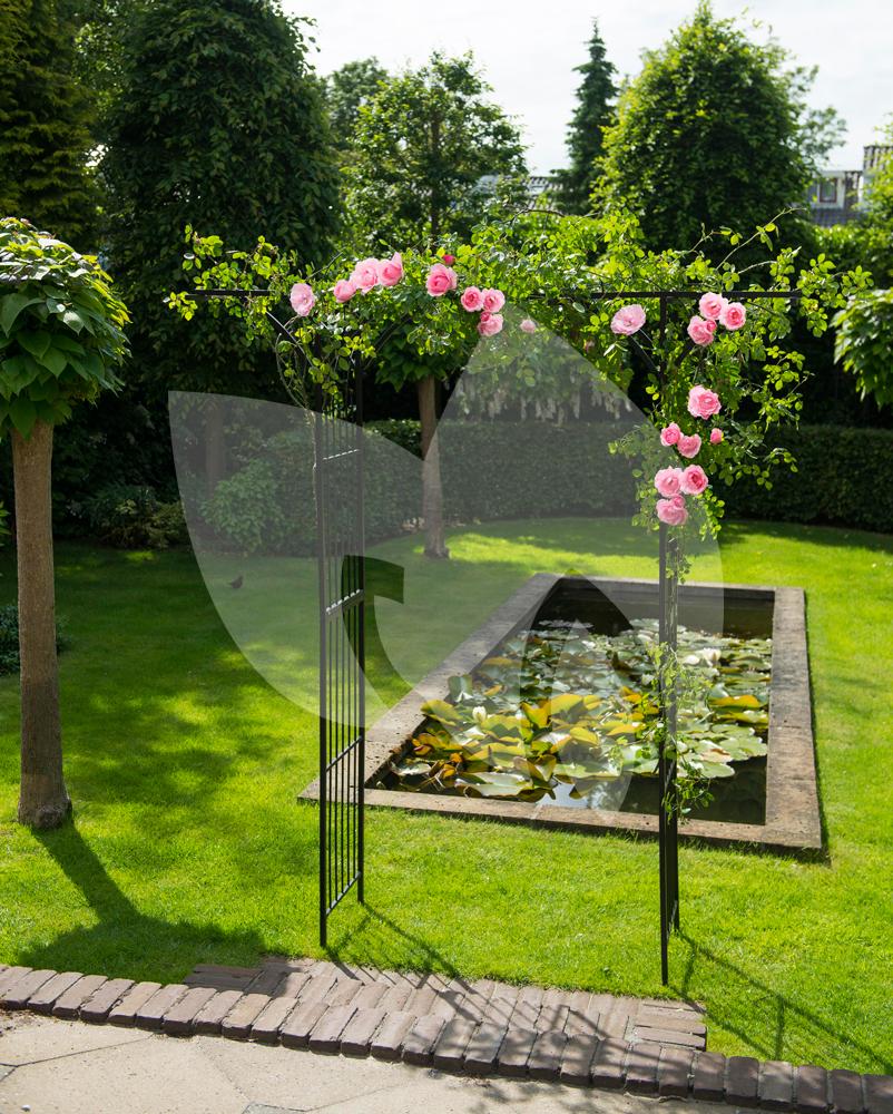 De New Dawn is een dubbele rechte rozenboog gemaakt van verzinkt staal met een zwarte epoxycoating. Aan de zijkanten is de rozenboog gedecoreerd met franse lelies. U kunt de rozenboog los in de tuin plaatsen of net bij binnenkomst. Naast een prachtige decoratie voor in uw tuin zal de rozenboog ook houvast bieden voor uw rozenstruiken en klimplanten.