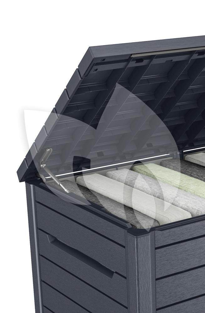 Deze opbergbox is de oplossing voor uw tuinkussens. Met een inhoud van 870 liter heeft deze box veel opbergruimte beschikbaar. De gasveer maakt dat u geen handen te kort heeft bij het opbergen en tevoorschijn halen van uw tuinkussen. Het kunststof met houtlook geeft de opbergbox een luxe uitstraling waardoor de opbergbox zeker gezien mag worden op uw terras.