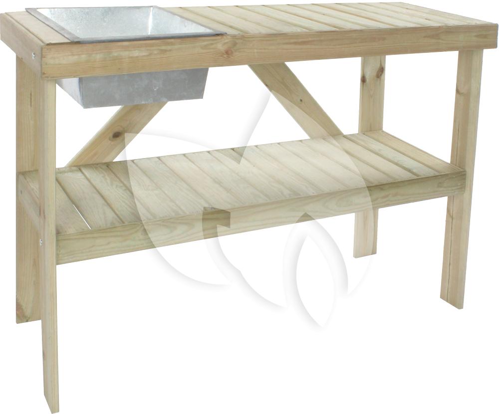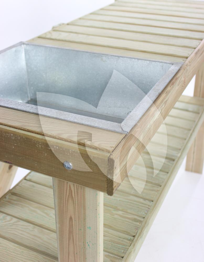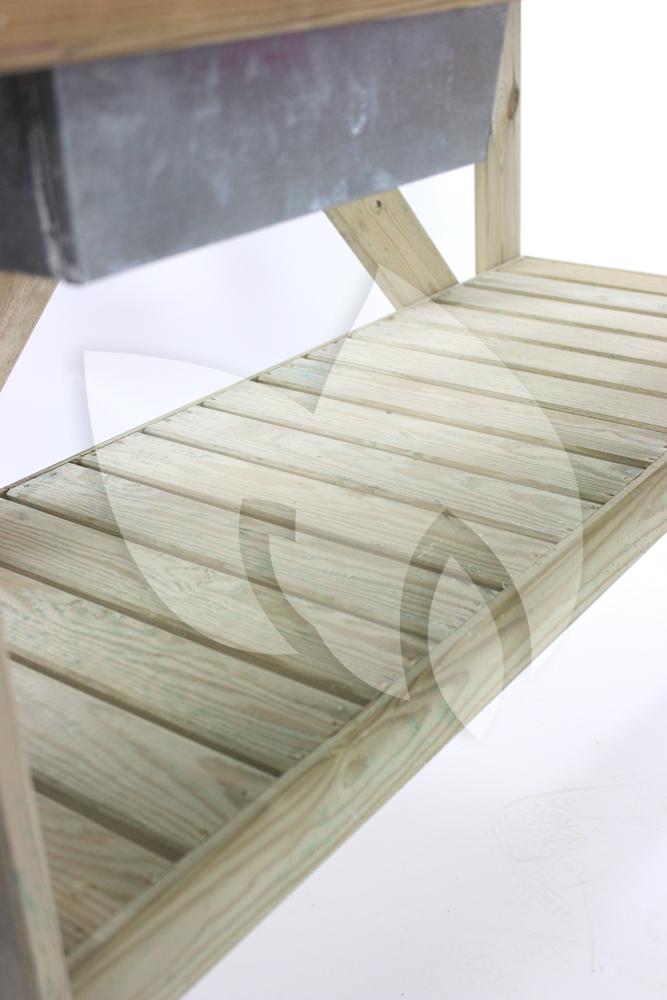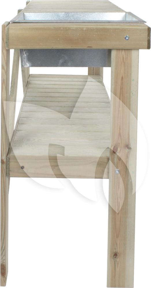 De oppottafel is gemaakt van geïmpregneerd grenen en voorzien van zinken bak op het werkblad. Met een lengte van 122cm heeft u meer dan genoeg werkruimte. Op het tweede plateau kunt u uw ongebruikte potten kwijt of enkele decoratieve items om de oppottafel aan te kleden.